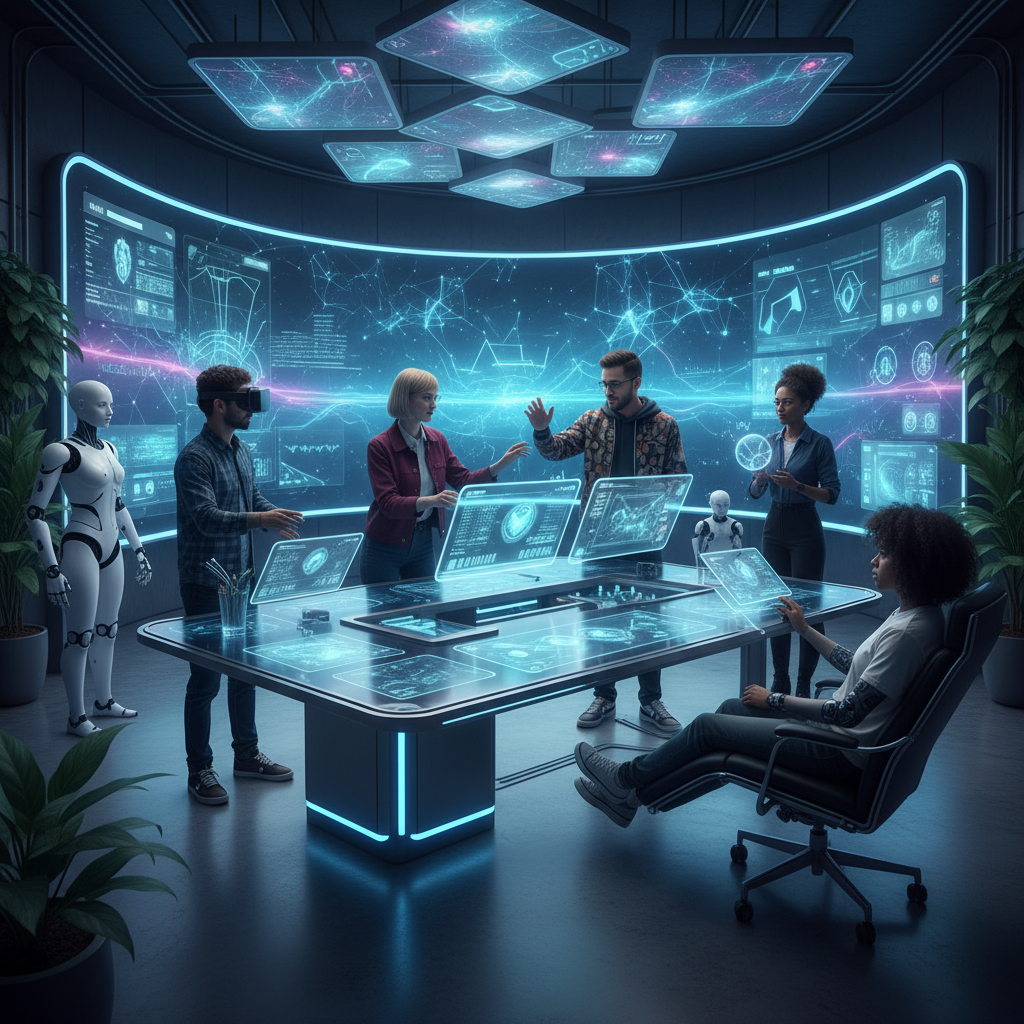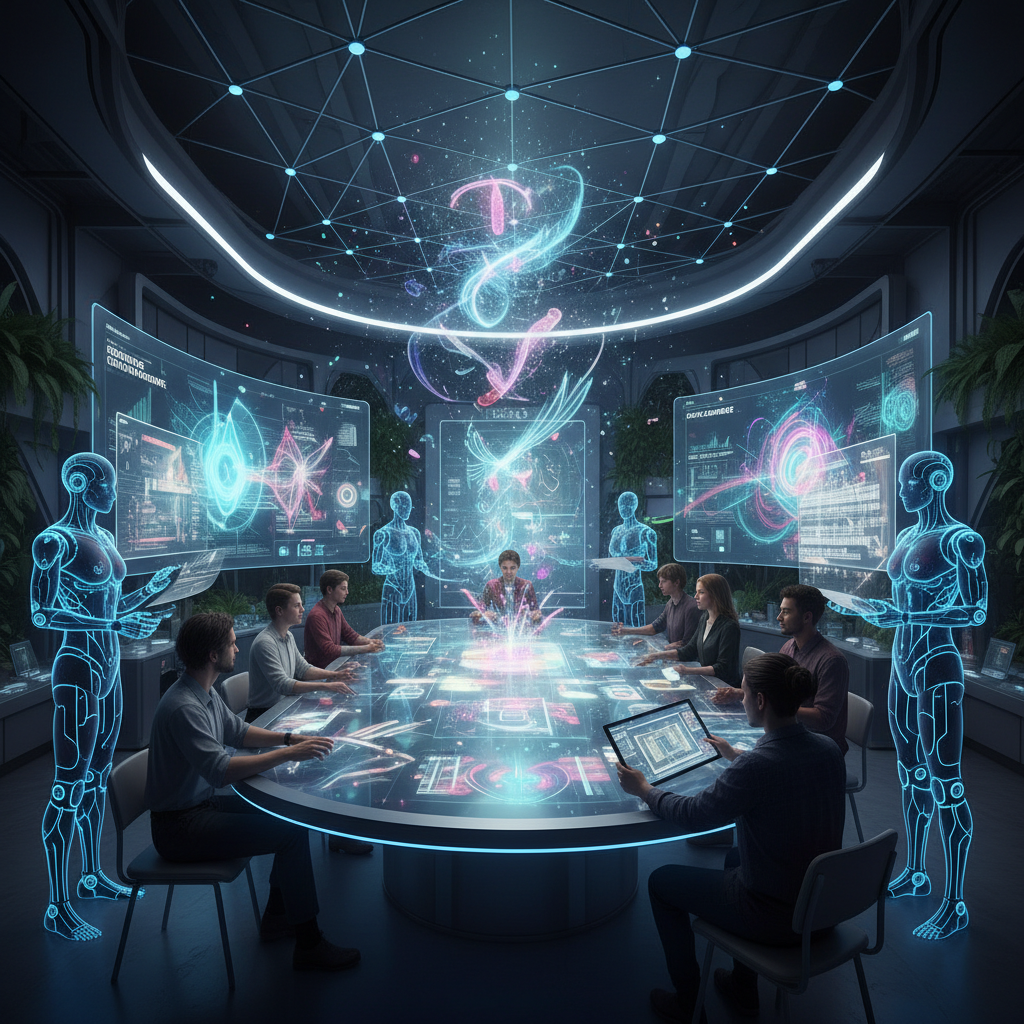 Nowoczesna platforma kreatywna z zespołem ludzi i AI przy pracy, odzwierciedlająca zmieniające się modele współpracy w marketingu.