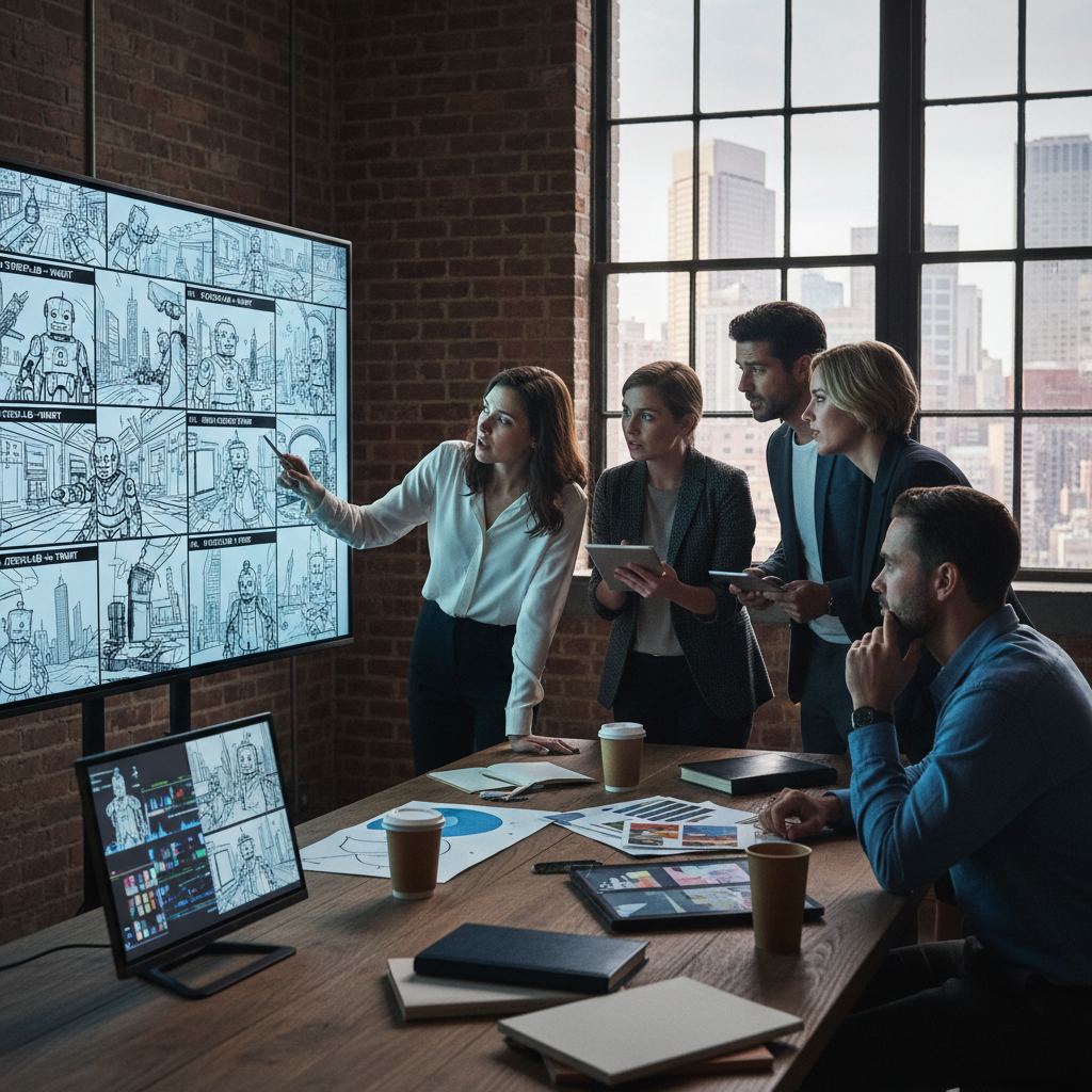 Zespół kreatywny analizuje storyboardy stworzone przez AI – kreatywność czy tylko automatyzacja?